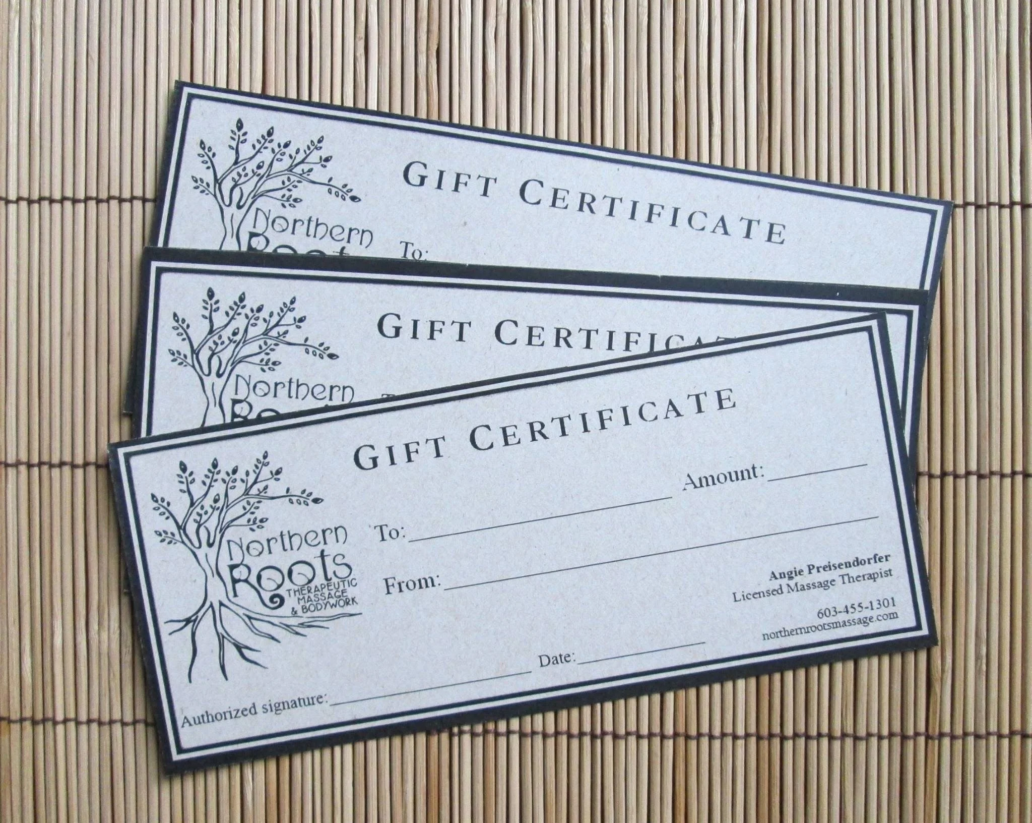 Gift Certificates Gift Certificates are available in any dollar amount. Can be emailed to you or picked up at Northern Roots Massage. Please call or text 603-455-1301 to place your order.